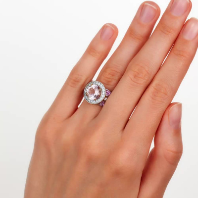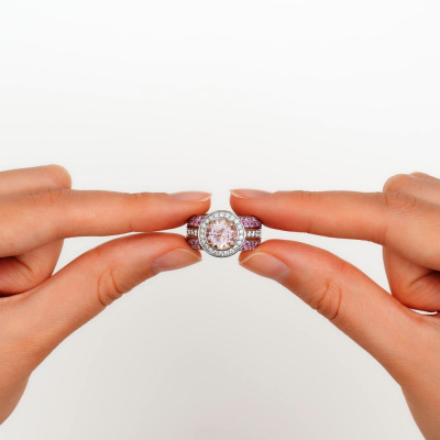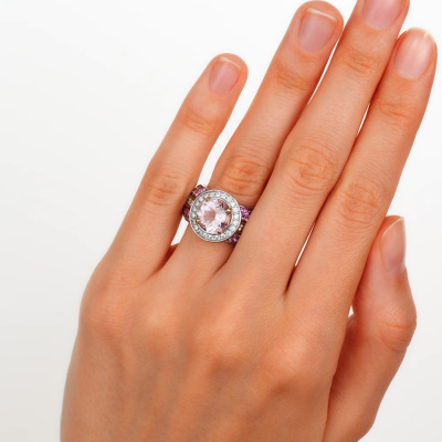 Кольцо с 16 бриллиантами природными, 0.32 карат, огранка круг 57 граней, цвет 3, чистота 6, тип огранки А; 22 бриллиантами природными, 0.28 карат, огранка круг 57 граней, цвет 3, чистота 6, тип огранки А; 1 морганитом природным, 2.68 карат; 156 сапфирами розовыми природными, 3.25 карат; Желтое и белое золото 585 пробы.