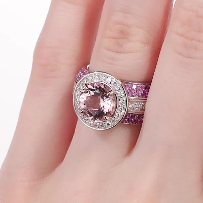 Кольцо с 16 бриллиантами природными, 0.3 карат, огранка круг 57 граней, цвет 3, чистота 6, тип огранки А; 22 бриллиантами природными, 0.3 карат, огранка круг 57 граней, цвет 3, чистота 6, тип огранки А; 1 морганитом природным, 2.53 карат; 156 сапфирами розовыми природными, 3.03 карат; Желтое и белое золото 585 пробы.