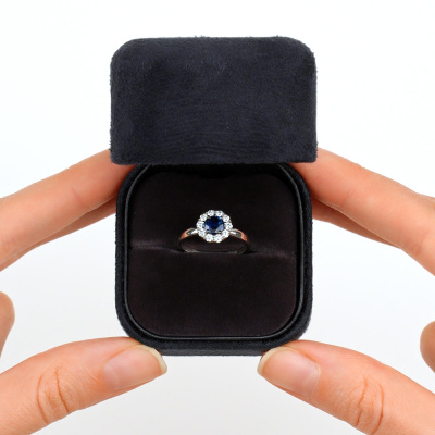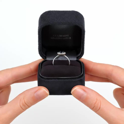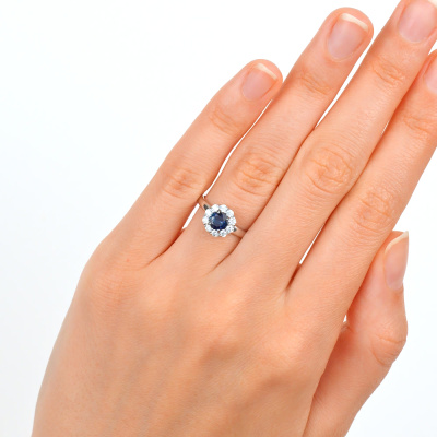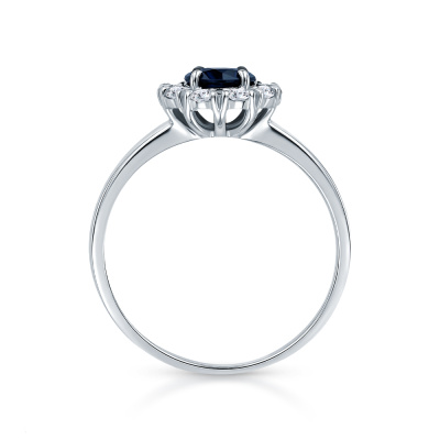 Кольцо с 10 бриллиантами природными, 0.293 карат, огранка круг 57 граней, цвет 3, чистота 6; 1 сапфиром природным, 0.624 карат, цвет 2, чистота 2; Белое золото 585 пробы.