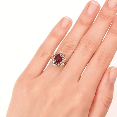 Кольцо с 1 рубином природным, 1.5 карат, цвет 2, чистота 3, тип огранки Б; 6 бриллиантами коньячными природными, 0.34 карат, огранка круг 57 граней, цвет 7, чистота 5, тип огранки А; 12 бриллиантами коньячными природными, 0.37 карат, огранка круг 57 граней, цвет 7, чистота 5, тип огранки А; 6 бриллиантами коньячными природными, 0.17 карат, огранка круг 57 граней, цвет 7, чистота 5, тип огранки А; Розовое золото 585 пробы.