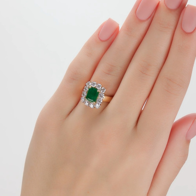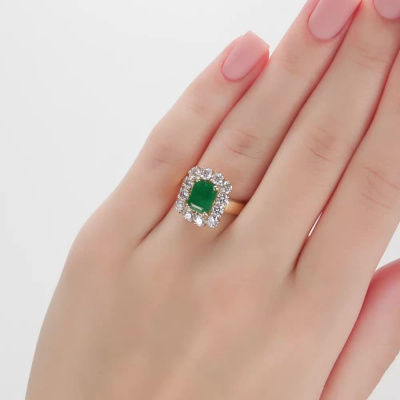 Кольцо с 12 бриллиантами природными, 1.158 карат, огранка круг 57 граней, цвет 4, чистота 6; 1 изумрудом природным, 1.35 карат, цвет 3, чистота 3; Желтое золото 585 пробы.