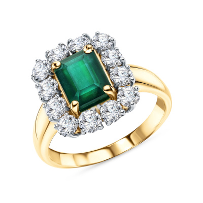 Кольцо с 12 бриллиантами природными, 1.15 карат, огранка круг 57 граней, цвет 4, чистота 6, тип огранки А; 1 изумрудом природным, 1.35 карат, цвет 3, чистота 3, тип огранки Б; Желтое золото 585 пробы.