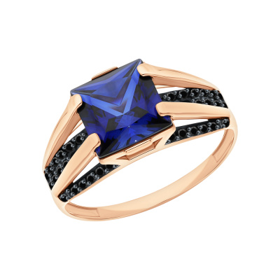 Кольцо с 1 сапфиром синтетическим, 3.19 карат, тип огранки Б; черным фианитом; Розовое золото 585 пробы.