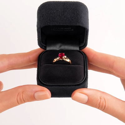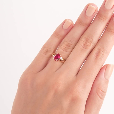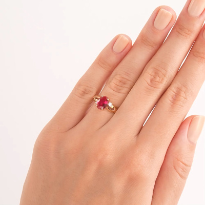 Кольцо с 1 рубином синтетическим, 1.36 карат; 2 сапфирами бесцветными природными, 0.07 карат; Розовое золото 585 пробы.