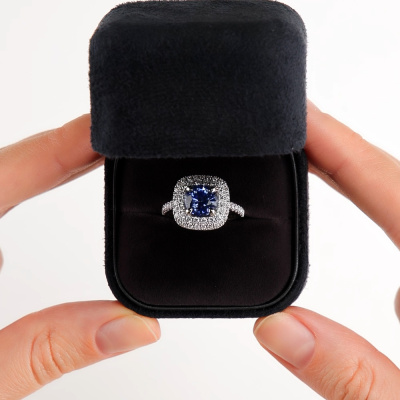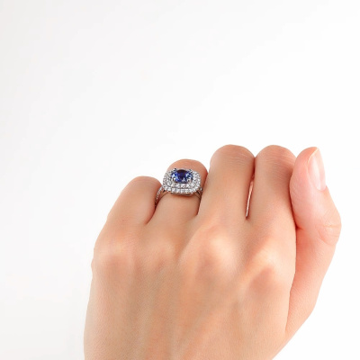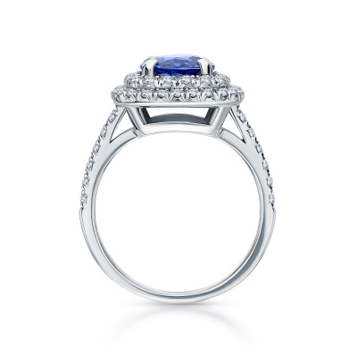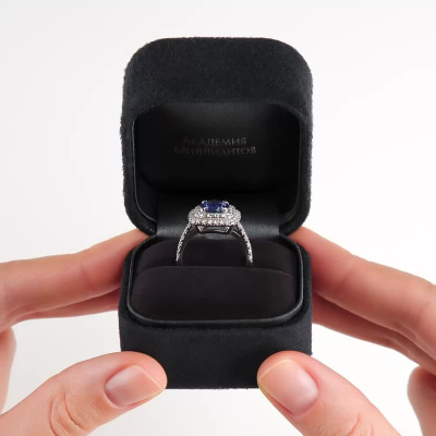 Кольцо с 30 бриллиантами природными, 0.45 карат, огранка круг 57 граней, цвет 3, чистота 6, тип огранки А; 27 бриллиантами природными, 0.24 карат, огранка круг 57 граней, цвет 3, чистота 6, тип огранки А; 1 сапфиром природным, 2.18 карат, цвет 3, чистота 2, тип огранки В; Белое золото 585 пробы.