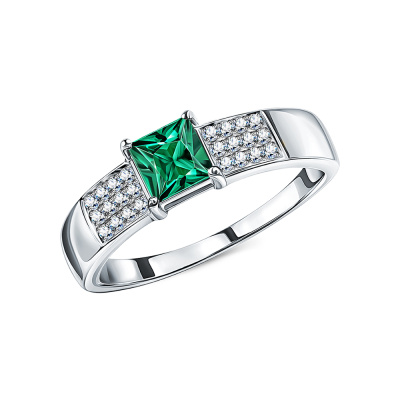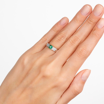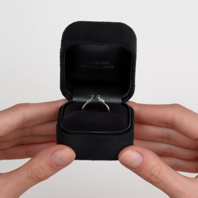 Кольцо с 24 бриллиантами природными, 0.04 карат, огранка круг 17 граней, цвет 2, чистота 2, тип огранки А; 1 гидротермальным изумрудом, 0.28 карат; Белое золото 585 пробы.