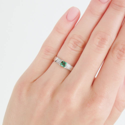 Кольцо с 24 бриллиантами природными, 0.04 карат, огранка круг 17 граней, цвет 2, чистота 2, тип огранки А; 1 гидротермальным изумрудом, 0.29 карат; Белое золото 585 пробы.