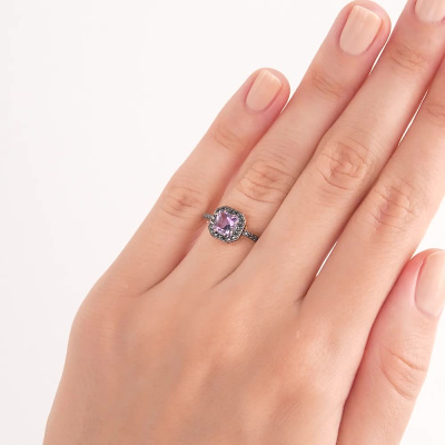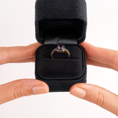 Кольцо с 1 аметистом природным, 0.58 карат; 42 бриллиантами черными природными облагороженными, 0.16 карат, огранка круг 57 граней, цвет 7, чистота 6, тип огранки А; Розовое золото 585 пробы.