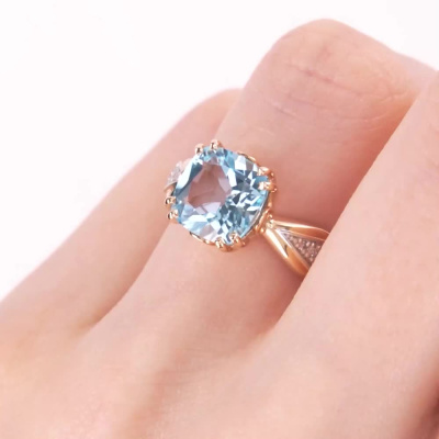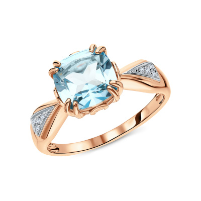 Кольцо с 8 бриллиантами природными, 0.04 карат, огранка круг 17 граней, цвет 2, чистота 2, тип огранки А; 1 топазом скай природным, 3.63 карат; Розовое золото 585 пробы.