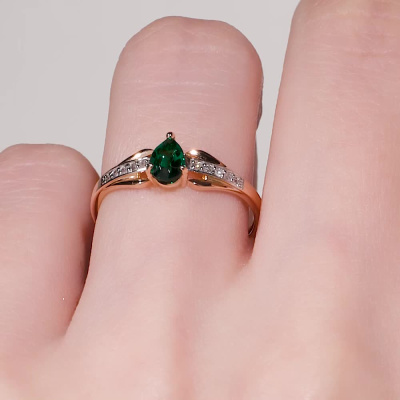 Кольцо с 10 бриллиантами природными, 0.04 карат, огранка круг 17 граней, цвет 2, чистота 2, тип огранки А; 1 гидротермальным изумрудом, 0.33 карат, тип огранки Б; Розовое золото 585 пробы.
