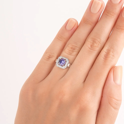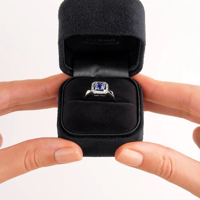 Кольцо с 24 бриллиантами природными, 0.07 карат, огранка круг 17 граней, цвет 2, чистота 2, тип огранки А; 1 танзанитом природным, 0.82 карат; Белое золото 585 пробы.