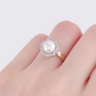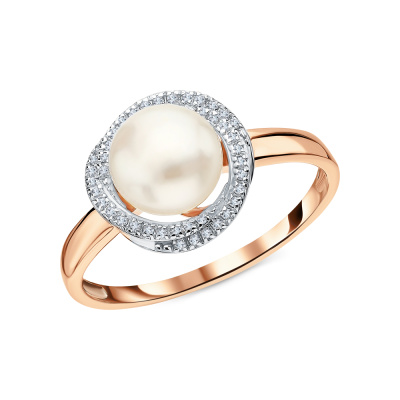 Кольцо с 42 бриллиантами природными, 0.08 карат, огранка круг 17 граней, цвет 2, чистота 2, тип огранки А; 1 жемчугом пресноводным культивированным белым; Розовое золото 585 пробы.