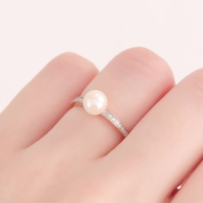 Кольцо с 14 бриллиантами природными, 0.03 карат, огранка круг 17 граней, цвет 2, чистота 2, тип огранки А; 1 жемчугом пресноводным культивированным белым; Розовое золото 585 пробы.