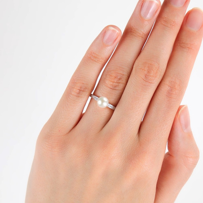 Кольцо с 14 бриллиантами природными, 0.029 карат, огранка круг 17 граней, цвет 2, чистота 2, тип огранки А; 1 жемчугом пресноводным культивированным белым; Розовое золото 585 пробы.