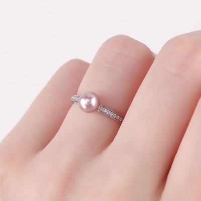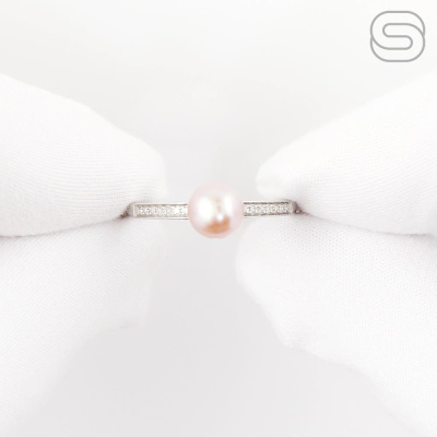Кольцо с 14 бриллиантами природными, 0.03 карат, огранка круг 17 граней, цвет 2, чистота 2, тип огранки А; 1 жемчугом пресноводным культивированным розовым, тип огранки В; Белое золото 585 пробы.