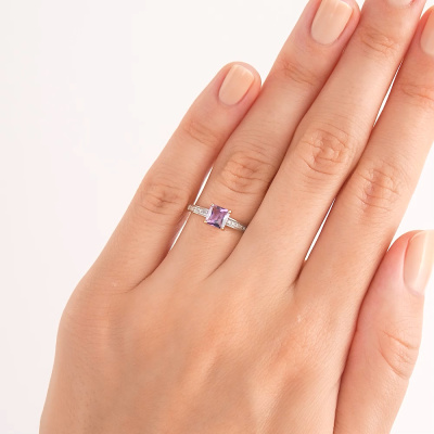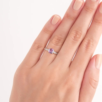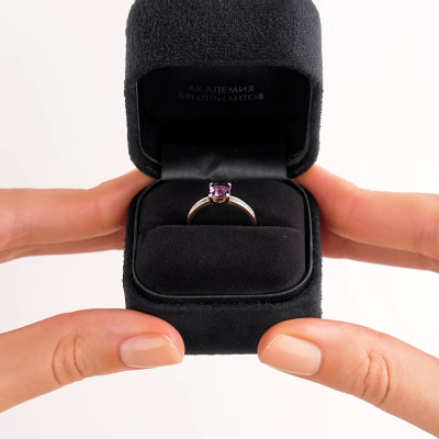 Кольцо с 14 бриллиантами природными, 0.03 карат, огранка круг 17 граней, цвет 2, чистота 2, тип огранки А; 1 аметистом природным, 0.56 карат; Розовое золото 585 пробы.