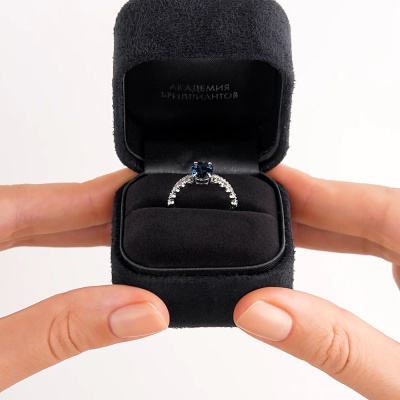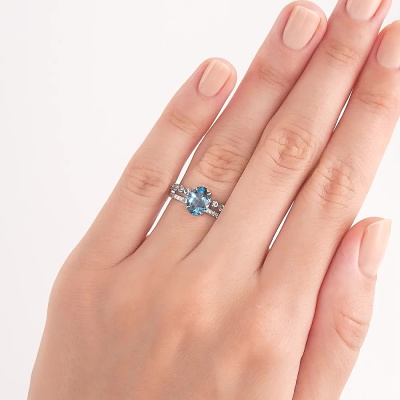 Кольцо с 20 бриллиантами природными, 0.07 карат, огранка круг 17 граней, цвет 2, чистота 2, тип огранки А; 1 топазом лондон природным, 1.39 карат; 10 топазами бесцветными природными, 0.18 карат; Белое золото 585 пробы.
