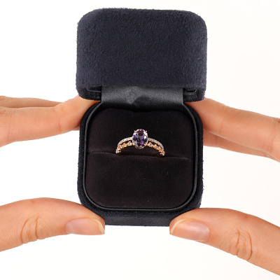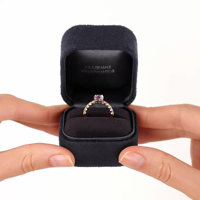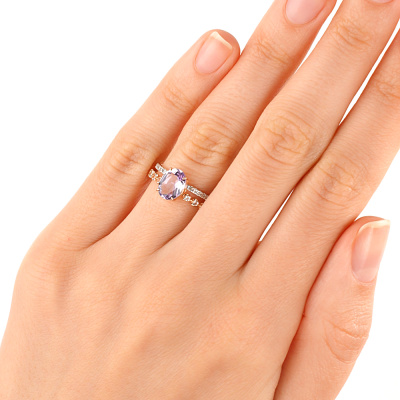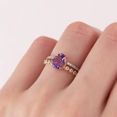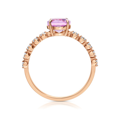 Кольцо с 1 аметистом, 1.1 карат, тип огранки Б; 10 топазами бесцветными, 0.16 карат, тип огранки В; 20 бриллиантами, 0.08 карат, огранка круг 17 граней, цвет 2, чистота 2, тип огранки А; Розовое золото 585 пробы.