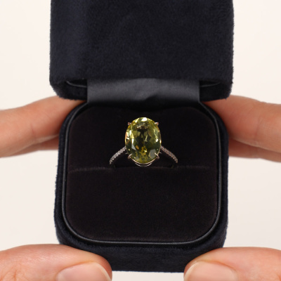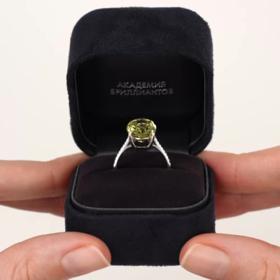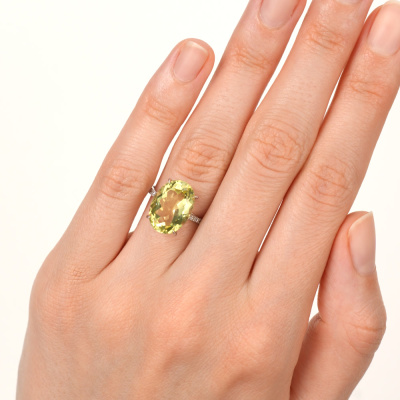 Кольцо «Бриллианты Якутии» с 1 кварцем лимонным, 5.102 карат, тип огранки Б; 18 бриллиантами, 0.079 карат, огранка круг 17 граней, цвет 2, чистота 2, тип огранки Б; Белое золото 585 пробы.