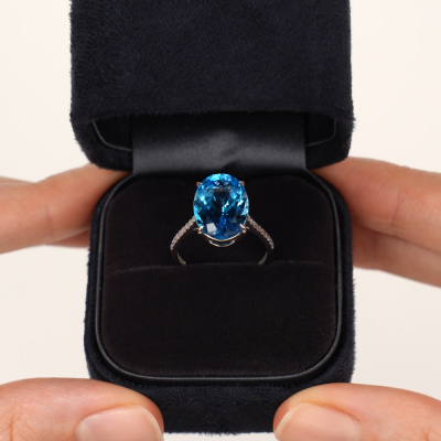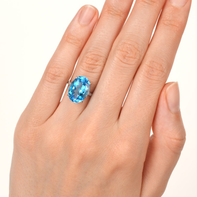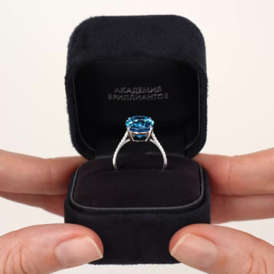 Кольцо с 1 топазом свисс, 6.87 карат, тип огранки Б; 18 бриллиантами, 0.07 карат, огранка круг 17 граней, цвет 2, чистота 2, тип огранки А; Белое золото 585 пробы.