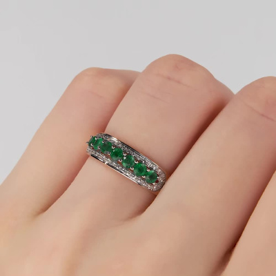 Кольцо с 38 бриллиантами природными, 0.09 карат, огранка круг 17 граней, цвет 2, чистота 2, тип огранки А; 7 изумрудами природными, 0.42 карат, цвет 3, чистота 3, тип огранки В; Розовое золото 585 пробы.