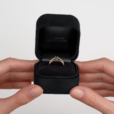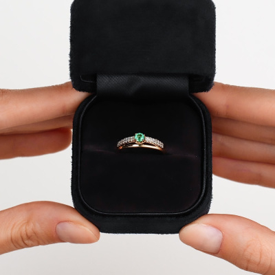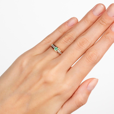 Кольцо с 28 бриллиантами природными, 0.07 карат, огранка круг 17 граней, цвет 2, чистота 2, тип огранки Б; 1 изумрудом природным, 0.15 карат, цвет 3, чистота 3, тип огранки В; Розовое золото 585 пробы.