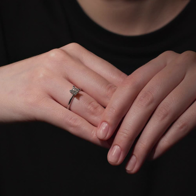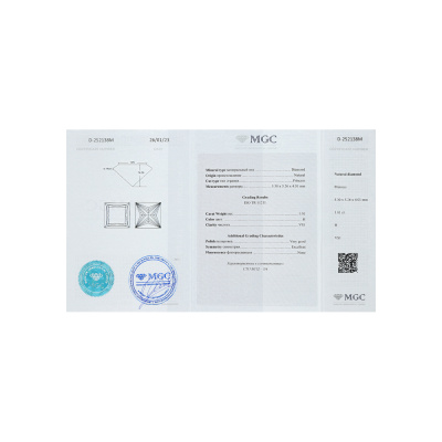 Кольцо с 1 бриллиантом природным, 1.01 карат, огранка принцесса 65 граней, цвет 5, чистота 7, тип огранки А; Платина 950 пробы.