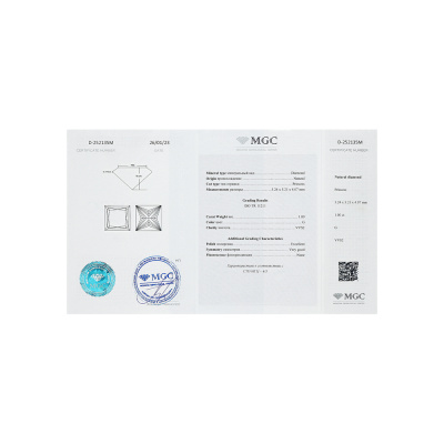Кольцо с 1 бриллиантом природным, 1 карат, огранка принцесса 65 граней, цвет 4, чистота 3, тип огранки А; Платина 950 пробы.