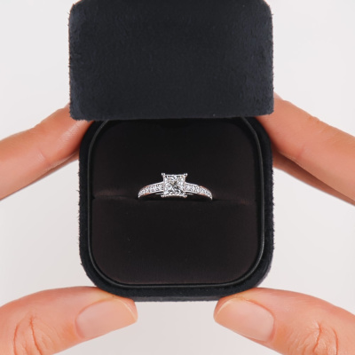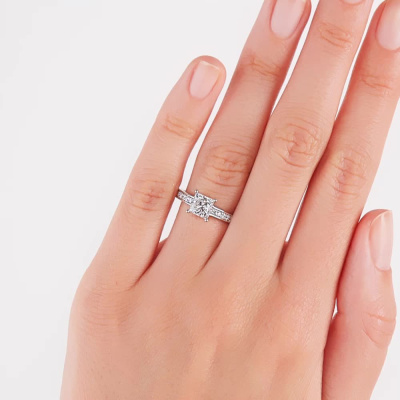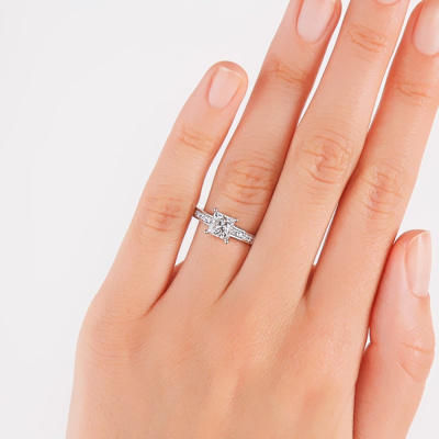 Кольцо с 1 бриллиантом природным, 1 карат, огранка принцесса 65 граней, цвет 4, чистота 5, тип огранки А; 14 бриллиантами природными, 0.19 карат, огранка круг 57 граней, цвет 3, чистота 6, тип огранки А; 2 бриллиантами природными, 0.02 карат, огранка круг 57 граней, цвет 3, чистота 6, тип огранки А; Белое золото 750 пробы.