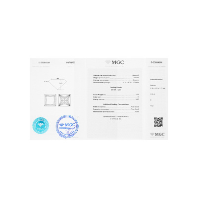 Кольцо с 1 бриллиантом природным, 1 карат, огранка принцесса 65 граней, цвет 2, чистота 5, тип огранки А; 16 бриллиантами природными, 0.22 карат, огранка круг 57 граней, цвет 3, чистота 6, тип огранки А; Белое золото 750 пробы.