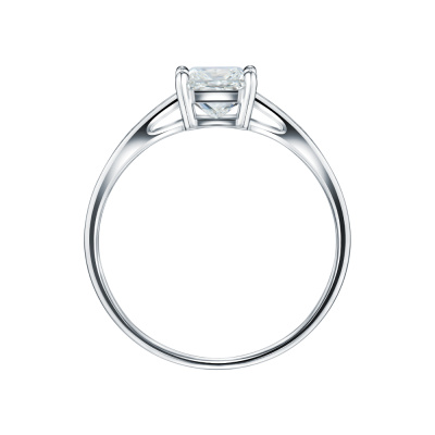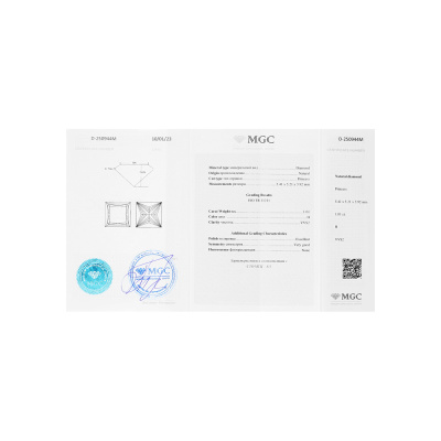 Кольцо с 1 бриллиантом природным, 1.01 карат, огранка принцесса 65 граней, цвет 5, чистота 3, тип огранки А; 16 бриллиантами природными, 0.22 карат, огранка круг 57 граней, цвет 3, чистота 6, тип огранки А; Белое золото 750 пробы.