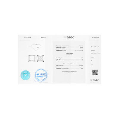 Кольцо с 1 бриллиантом природным, 1.2 карат, огранка принцесса 65 граней, цвет 5, чистота 6, тип огранки А; 16 бриллиантами природными, 0.2 карат, огранка круг 57 граней, цвет 3, чистота 6, тип огранки А; Белое золото 750 пробы.