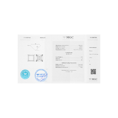 Кольцо с 1 бриллиантом природным, 1 карат, огранка принцесса 65 граней, цвет 3, чистота 6, тип огранки А; 16 бриллиантами природными, 0.24 карат, огранка круг 57 граней, цвет 3, чистота 6, тип огранки А; Белое золото 750 пробы.