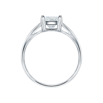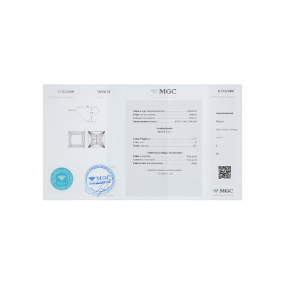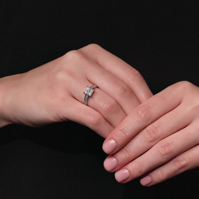 Кольцо с 1 бриллиантом природным, 1.01 карат, огранка принцесса 65 граней, цвет 2, чистота 6, тип огранки А; 16 бриллиантами природными, 0.24 карат, огранка круг 57 граней, цвет 3, чистота 6, тип огранки А; Белое золото 750 пробы.