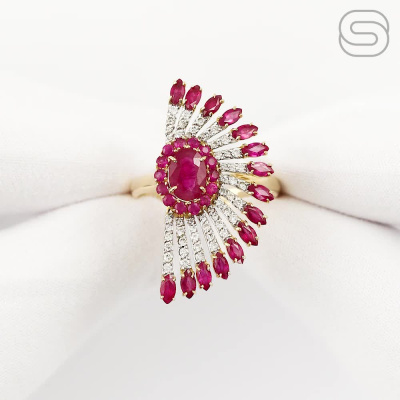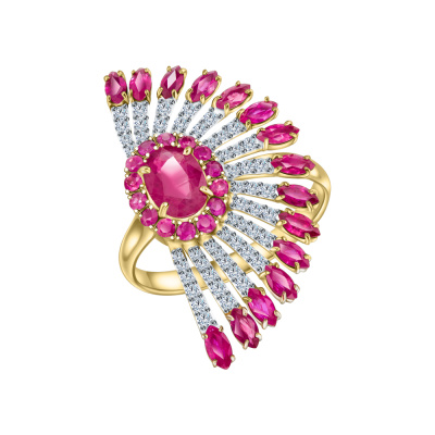 Кольцо с 1 рубином, 0.811 карат, цвет 2, чистота 2, тип огранки Б; 15 рубинами, 1.244 карат, цвет 2, чистота 2, тип огранки Б; 14 рубинами, 0.393 карат, цвет 2, чистота 2, тип огранки В; 16 бриллиантами, 0.137 карат, огранка круг 57 граней, цвет 3, чистота 5, тип огранки А; 19 бриллиантами, 0.136 карат, огранка круг 57 граней, цвет 3, чистота 5, тип огранки А; 17 бриллиантами, 0.059 карат, огранка круг 57 граней, цвет 3, чистота 5, тип огранки А; Желтое золото 585 пробы.