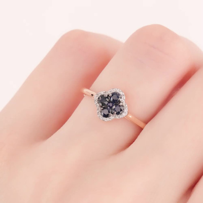 Кольцо с 24 бриллиантами природными, 0.05 карат, огранка круг 17 граней, цвет 2, чистота 2, тип огранки Б; 4 сапфирами природными, 0.38 карат, цвет 2, чистота 2, тип огранки В; 1 сапфиром природным, 0.03 карат, цвет 2, чистота 2, тип огранки В; Розовое золото 585 пробы.