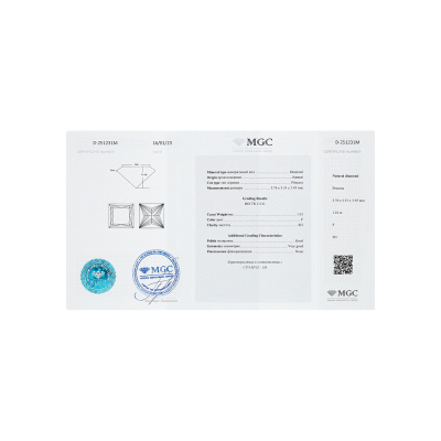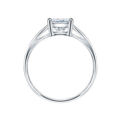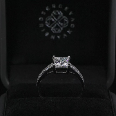 Кольцо с 1 бриллиантом природным, 1.01 карат, огранка принцесса 65 граней, цвет 3, чистота 6, тип огранки А; 16 бриллиантами природными, 0.21 карат, огранка круг 57 граней, цвет 3, чистота 6, тип огранки А; Белое золото 750 пробы.