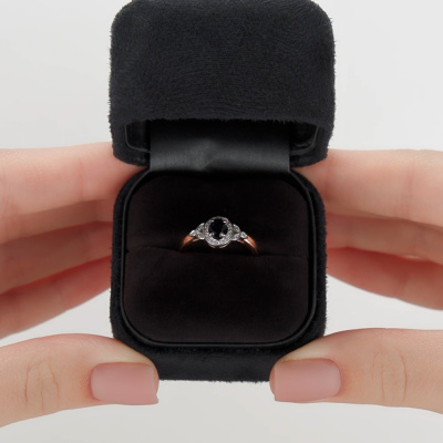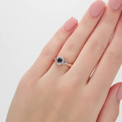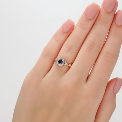 Кольцо с 26 бриллиантами природными, 0.05 карат, огранка круг 17 граней, цвет 2, чистота 2, тип огранки А; 1 сапфиром природным, 0.37 карат, цвет 2, чистота 2, тип огранки Б; Розовое золото 585 пробы.