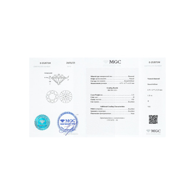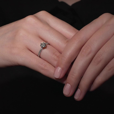 Кольцо «Бриллианты Якутии» с 1 бриллиантом, 1.16 карат, огранка круг 57 граней, цвет 5, чистота 4, тип огранки А; 14 бриллиантами, 0.166 карат, огранка круг 57 граней, цвет 3, чистота 6, тип огранки А; Платина 950 пробы.