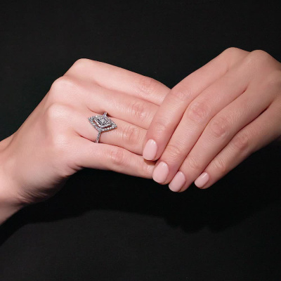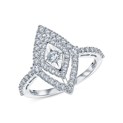 Кольцо с 1 бриллиантом природным, 0.07 карат, огранка круг 57 граней, цвет 3, чистота 6, тип огранки А; 2 бриллиантами природными, 0.06 карат, огранка круг 57 граней, цвет 3, чистота 6, тип огранки А; 36 бриллиантами природными, 0.34 карат, огранка круг 57 граней, цвет 3, чистота 6, тип огранки А; 14 бриллиантами природными, 0.12 карат, огранка круг 57 граней, цвет 3, чистота 6, тип огранки А; Белое золото 585 пробы.