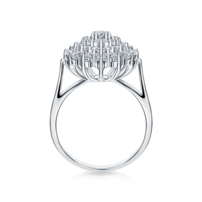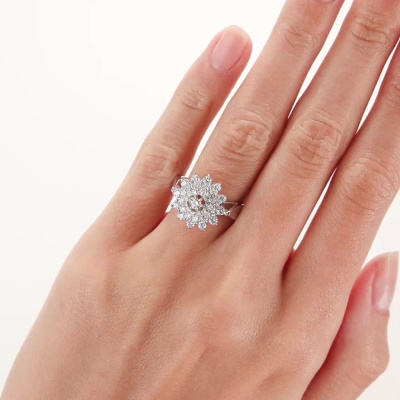 Кольцо с 1 бриллиантом природным, 0.07 карат, огранка круг 57 граней, цвет 3, чистота 6, тип огранки А; 12 бриллиантами природными, 0.35 карат, огранка круг 57 граней, цвет 3, чистота 6, тип огранки А; 12 бриллиантами природными, 0.29 карат, огранка круг 57 граней, цвет 3, чистота 6, тип огранки А; 12 бриллиантами природными, 0.06 карат, огранка круг 17 граней, цвет 2, чистота 2, тип огранки А; Белое золото 585 пробы.