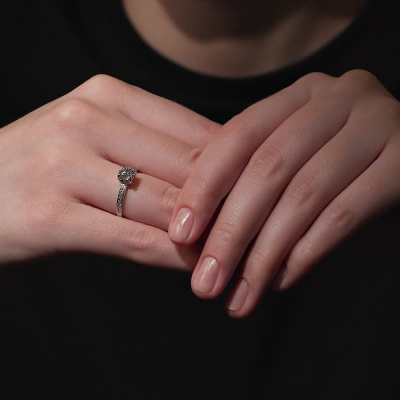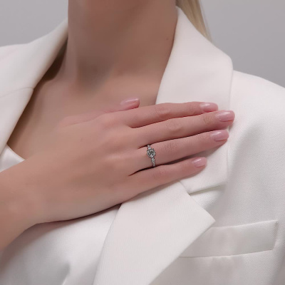 Кольцо с 1 бриллиантом природным, 1 карат, огранка круг 57 граней, цвет 4, чистота 5, тип огранки А; 16 бриллиантами природными, 0.16 карат, огранка круг 57 граней, цвет 3, чистота 6, тип огранки А; Белое золото 750 пробы.