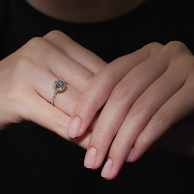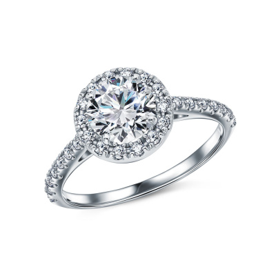 Кольцо с 1 бриллиантом природным, 1 карат, огранка круг 57 граней, цвет 2, чистота 4, тип огранки А; 14 бриллиантами природными, 0.13 карат, огранка круг 57 граней, цвет 3, чистота 6, тип огранки А; 14 бриллиантами природными, 0.11 карат, огранка круг 57 граней, цвет 3, чистота 6, тип огранки А; 1 бриллиантом природным, 0.005 карат, огранка круг 57 граней, цвет 3, чистота 6, тип огранки А; 11 бриллиантами природными, 0.02 карат, огранка круг 57 граней, цвет 3, чистота 6, тип огранки А; Белое золото 750 пробы.