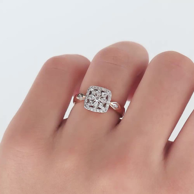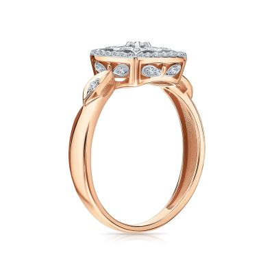 Кольцо с 1 бриллиантом, 0.02 карат, огранка круг 57 граней, цвет 4, чистота 5, тип огранки А; 6 бриллиантами, 0.03 карат, огранка круг 57 граней, цвет 4, чистота 5, тип огранки А; 32 бриллиантами, 0.1 карат, огранка круг 57 граней, цвет 4, чистота 5, тип огранки А; Розовое золото 585 пробы.