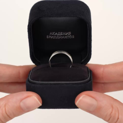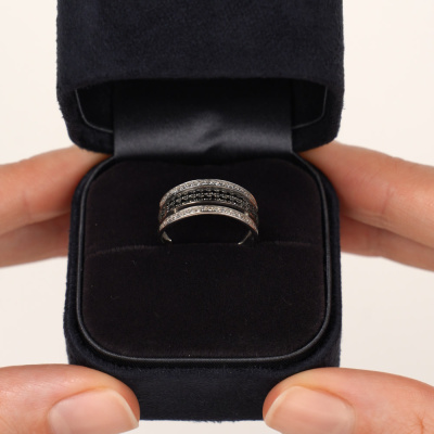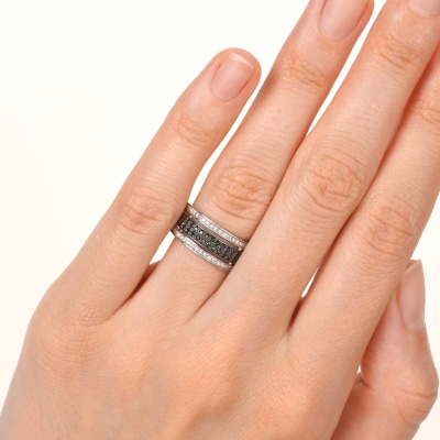 Кольцо с 40 бриллиантами природными, 0.11 карат, огранка круг 17 граней, цвет 2, чистота 2, тип огранки А; 34 бриллиантами черными природными облагороженными, 0.2 карат, огранка круг 57 граней, цвет 7, чистота 6, тип огранки А; Белое золото 585 пробы.