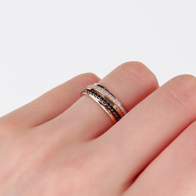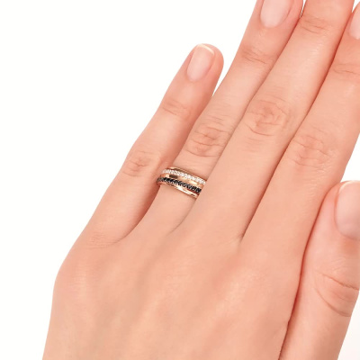 Кольцо с 25 бриллиантами природными, 0.1 карат, огранка круг 17 граней, цвет 2, чистота 2, тип огранки А; 20 бриллиантами черными природными облагороженными, 0.17 карат, огранка круг 57 граней, цвет 7, чистота 6, тип огранки А; Розовое золото 585 пробы.