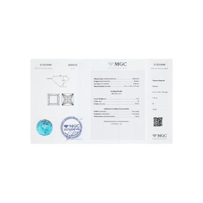 Кольцо с 1 бриллиантом природным, 1 карат, огранка принцесса 65 граней, цвет 3, чистота 6, тип огранки А; Платина 950 пробы.