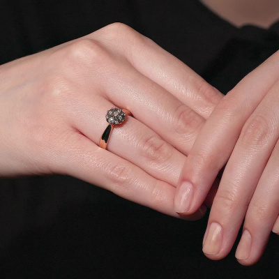 Кольцо с 4 бриллиантами природными, 0.04 карат, огранка круг 57 граней, цвет 3, чистота 6, тип огранки А; 4 бриллиантами природными, 0.02 карат, огранка круг 57 граней, цвет 3, чистота 6, тип огранки А; 4 бриллиантами природными, 0.01 карат, огранка круг 17 граней, цвет 2, чистота 2, тип огранки А; Розовое и белое золото 585 пробы.