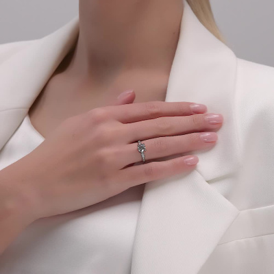 Кольцо с 1 бриллиантом природным, 1 карат, огранка круг 57 граней, цвет 4, чистота 6, тип огранки А; 16 бриллиантами природными, 0.16 карат, огранка круг 57 граней, цвет 3, чистота 6, тип огранки А; Белое золото 750 пробы.