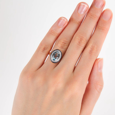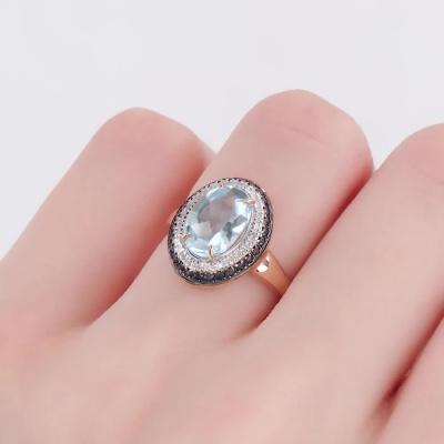 Кольцо с 28 бриллиантами природными, 0.12 карат, огранка круг 17 граней, цвет 2, чистота 2, тип огранки Б; 1 топазом скай природным, 2.51 карат; 28 сапфирами природными, 0.3 карат, цвет 2, чистота 2, тип огранки В; Розовое золото 585 пробы.
